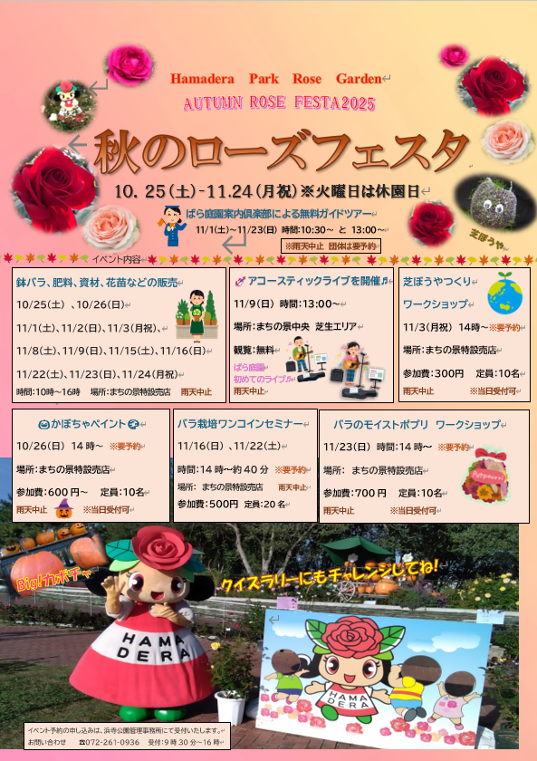 日時2025.10.25(土)~11.24(月・祝)火曜日は休園日 ばら庭園開園時間:10:00~最終入場16:00クローズ17:00、まちの景9:00~17:00