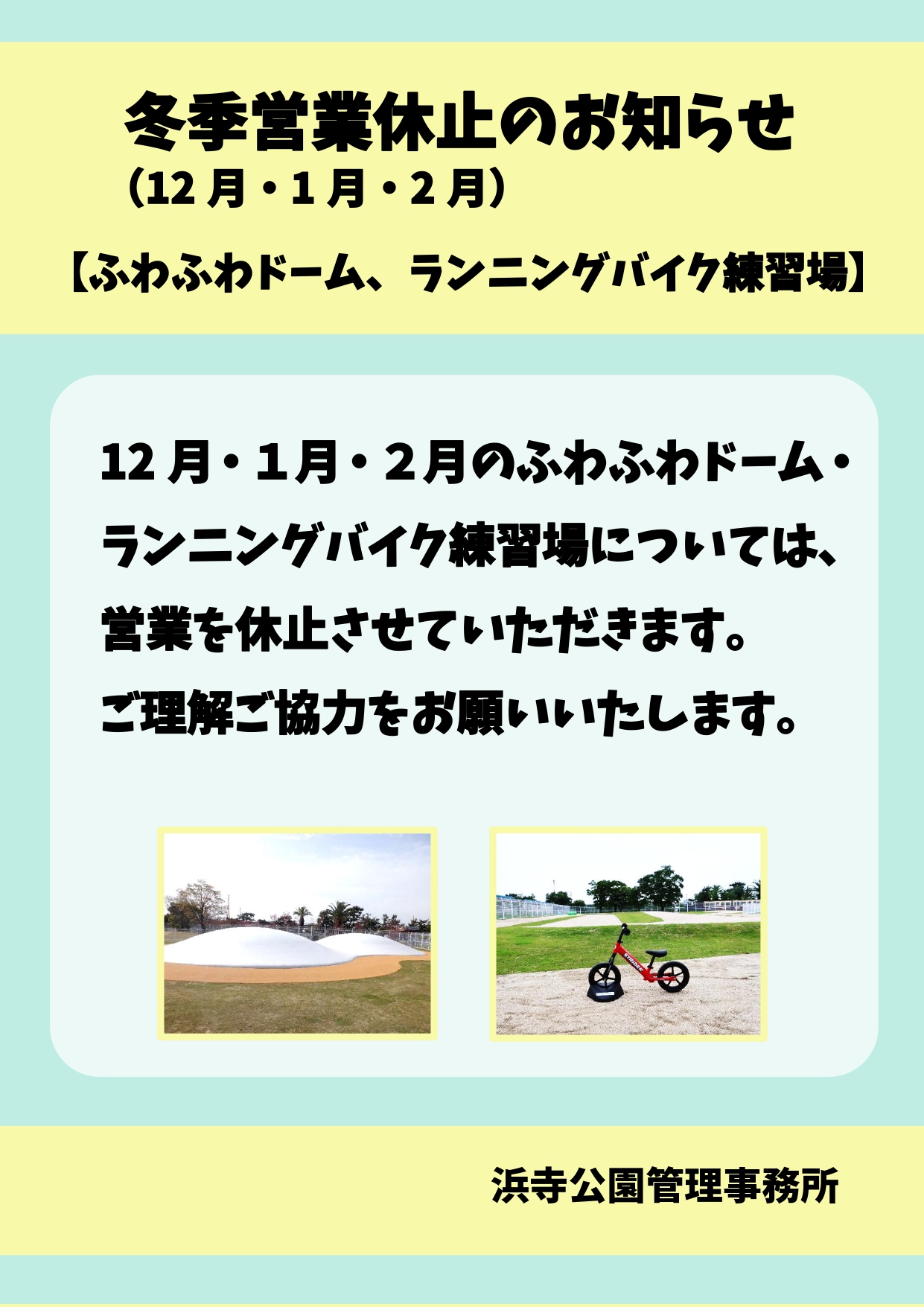 ふわふわドーム・ランニングバイク練習場 冬季営業休止のお知らせ