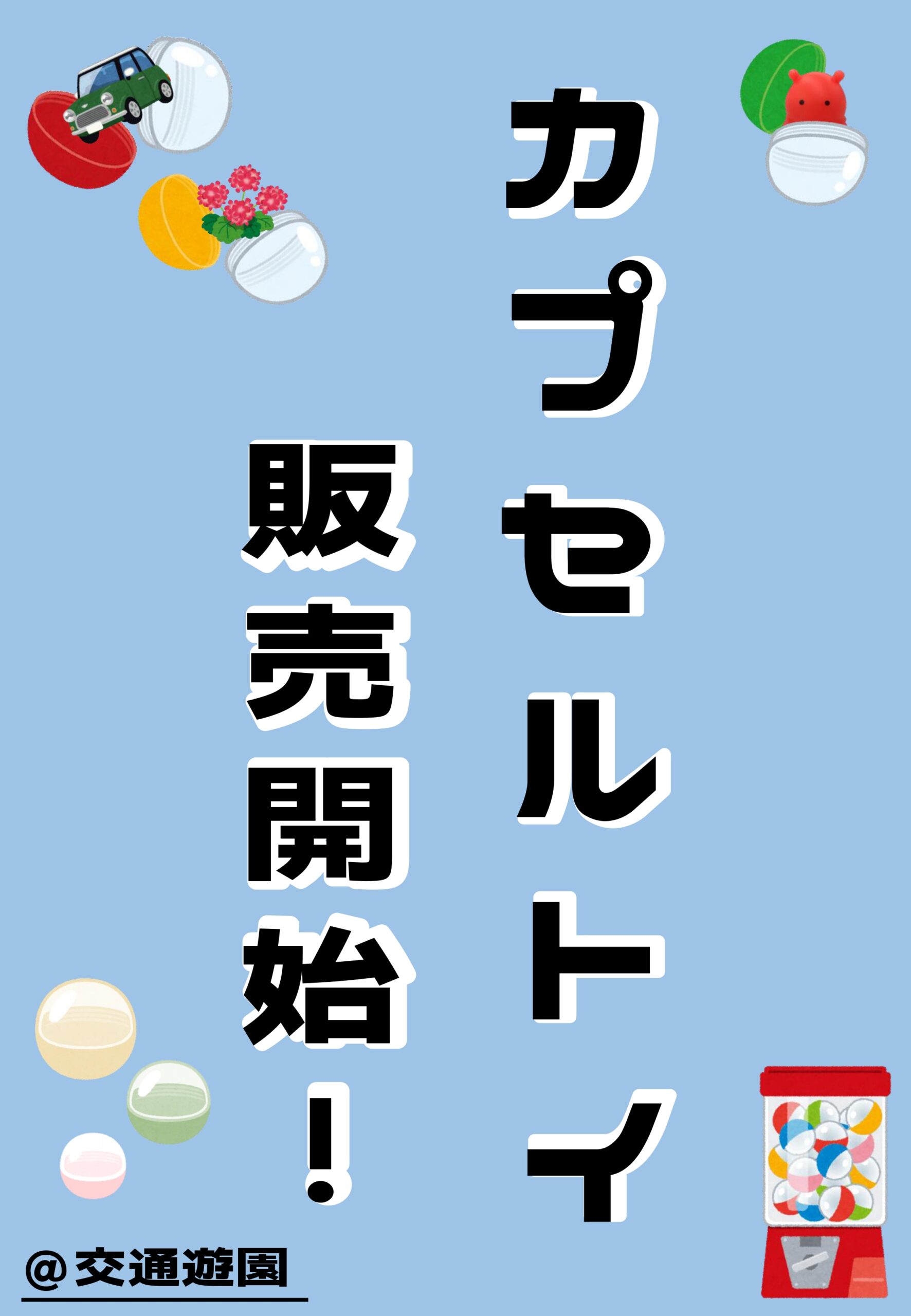 カプセルトイ販売開始 掲載日: 2025/09/22 浜寺公園交通遊園にて「カプセルトイ」を始めました! 車のおもちゃ、カプセルで育てる植物、かわいいメンダコのおもちゃなど様々なものを販売中です。 カプセルの中身は一期一会のため、何があるかはお楽しみに! 無くなり次第終了になるので、お早めにお越しください。