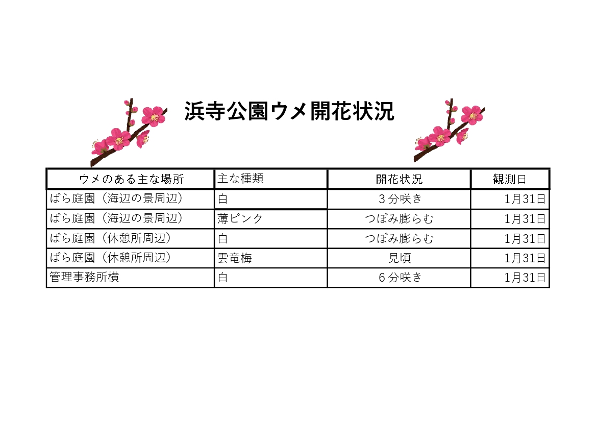 梅の開花状況のお知らせ 掲載日: 2026/01/31 特別公開のお知らせ ばら庭園おすすめの 梅の花スポットを特別公開いたします。 まだ寒さの残る季節に、 ひと足早く春を感じさせてくれる梅の花。 ぜひこの機会にお楽しみください。 2月中の(土)(日)(祝)のみ開園しています。