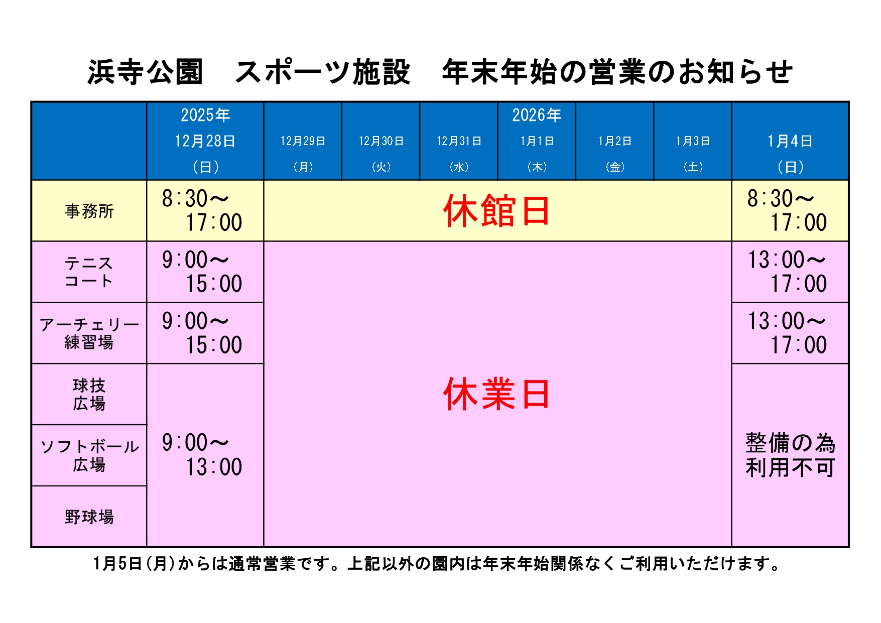 【年末年始のご案内】(スポーツ施設) 掲載日: 2025/12/01 浜寺公園管理事務所より、年末年始の営業につきましてお知らせいたします。 年末年始は、12/29(月)~1/3(土)が休館日となります。また、運動施設は整備の都合上、12/28(土)の営業終了時刻、1/4(土)の営業開始時刻が変わっています。 みなさま、ご理解・ご協力のほどよろしくお願いいたします。
