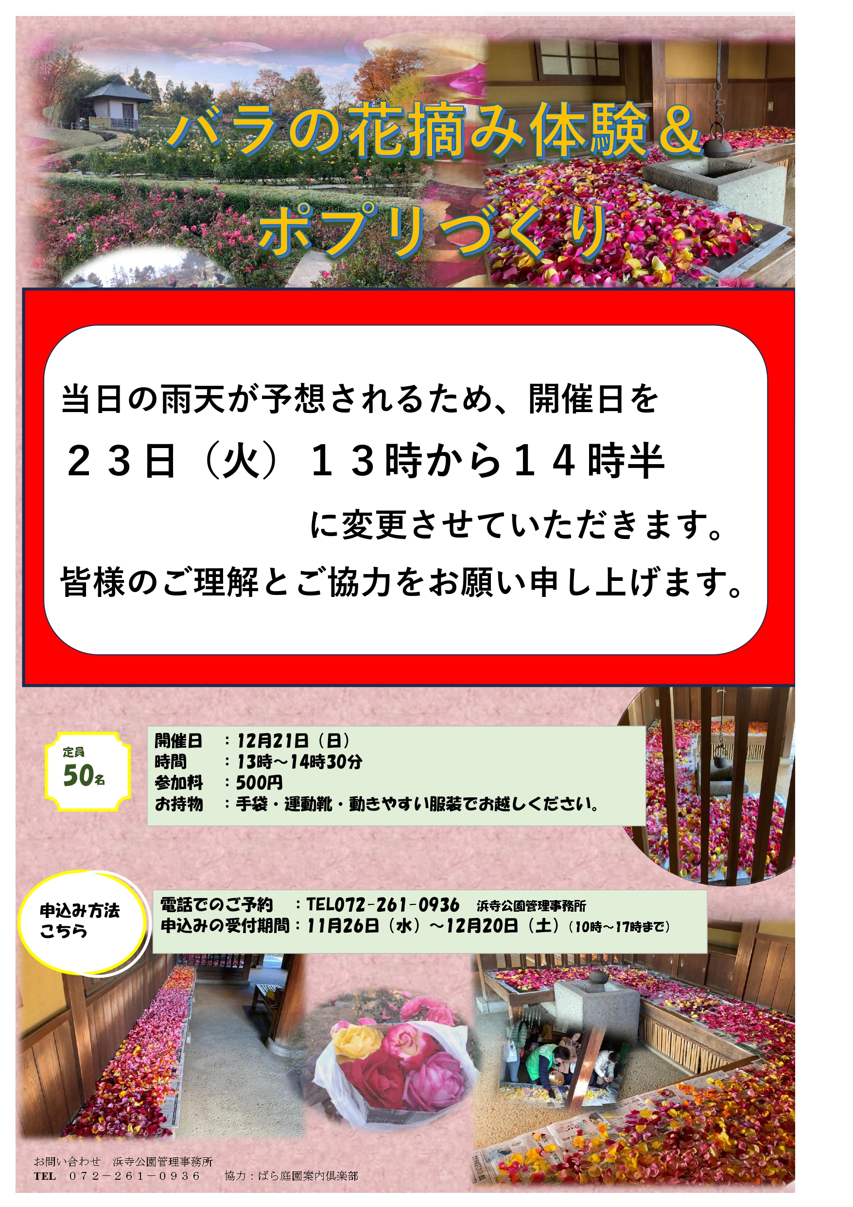 12月21日(日)開催とご案内いたしました「バラの花摘み体験&ポプリ作り」は、当日の雨天が予想されるため、12月23日(火)13時から14時半に変更させていただきます。